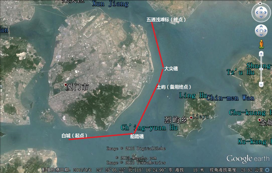拉力賽起點:廈大白城外海(起點) ——(1標:紅旗左舷繞,綠旗右舷繞)——轉(zhuǎn)折點:24°24′47.7″N,118 °09′10.6″E(船路礁燈標)——轉(zhuǎn)折點:土嶼三個黃色燈標(備用終點)——大尖礁燈標——五通淺灘標(終點)——五緣灣大橋