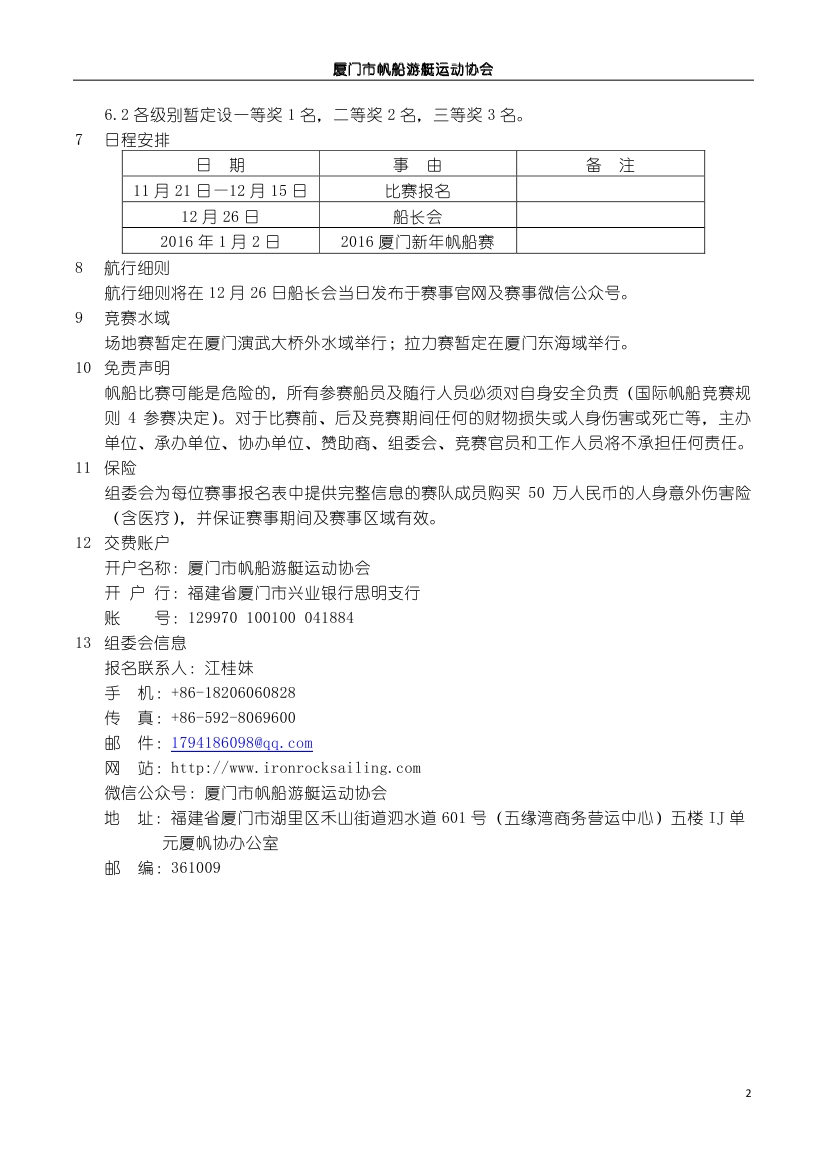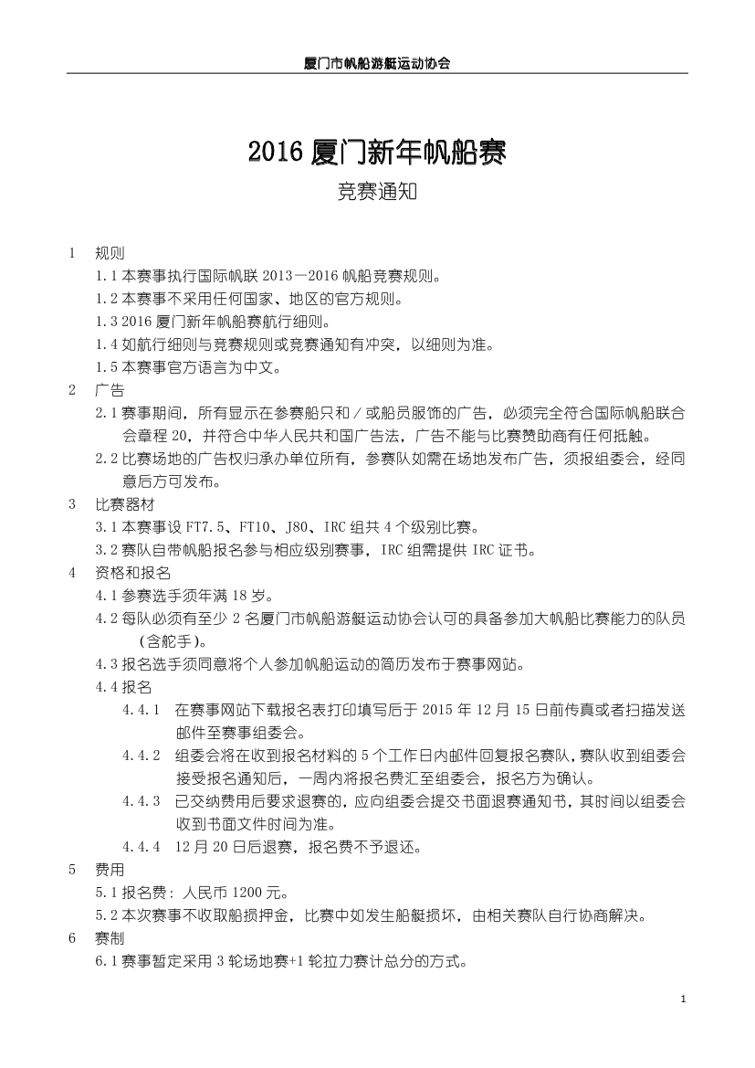 >2016廈門新年帆船賽競(jìng)賽通知