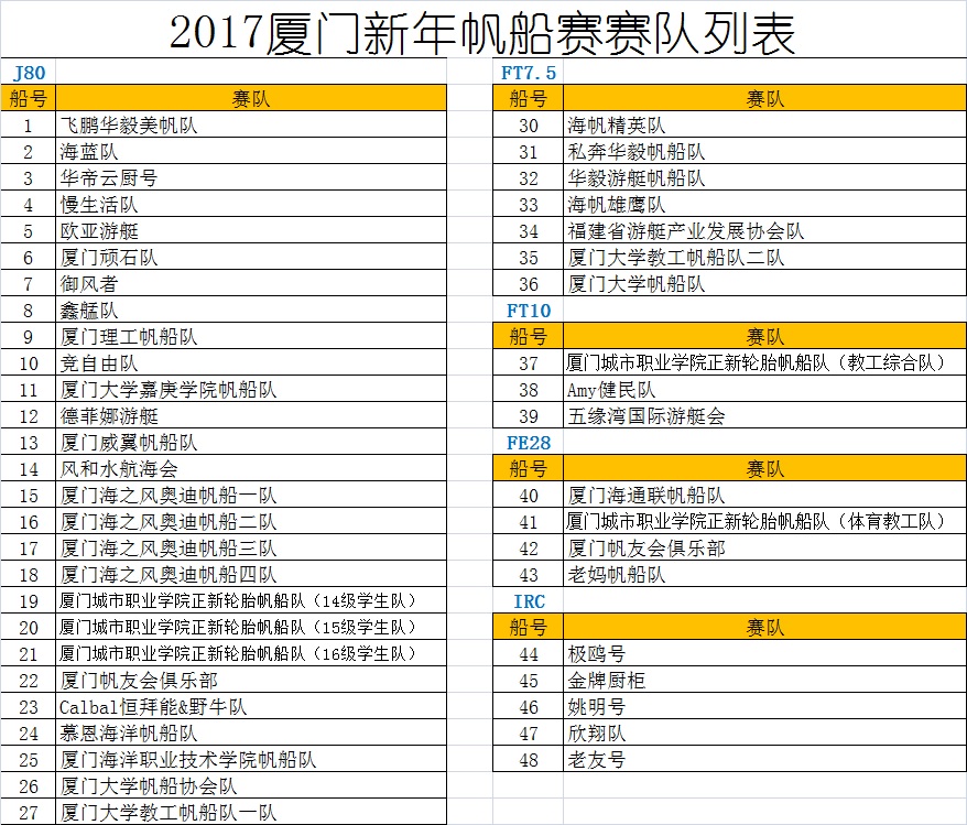 2017廈門新年帆船賽參賽隊(duì)伍